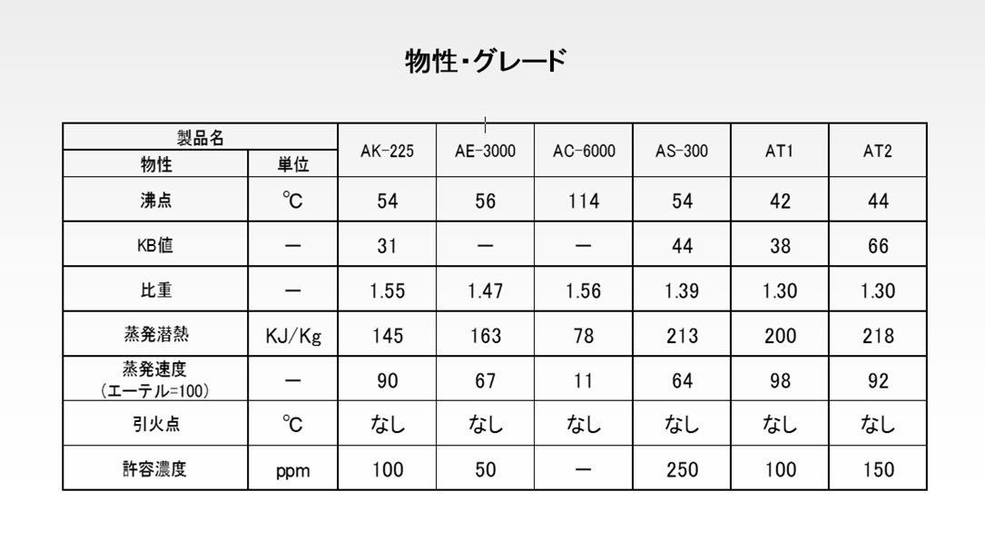 アサヒクリン AC-6000 は、オゾン破壊係数 ( ODP ) がゼロ、地球温暖化係数 ( GWP ) が 136 の HFC ( ハイドロフルオロカーボン ) で、PFC ( パーフルオロカーボン ) や PFPE ( パーフルオロポリエーテル ) と似た特性をもつフッ素系溶剤です。