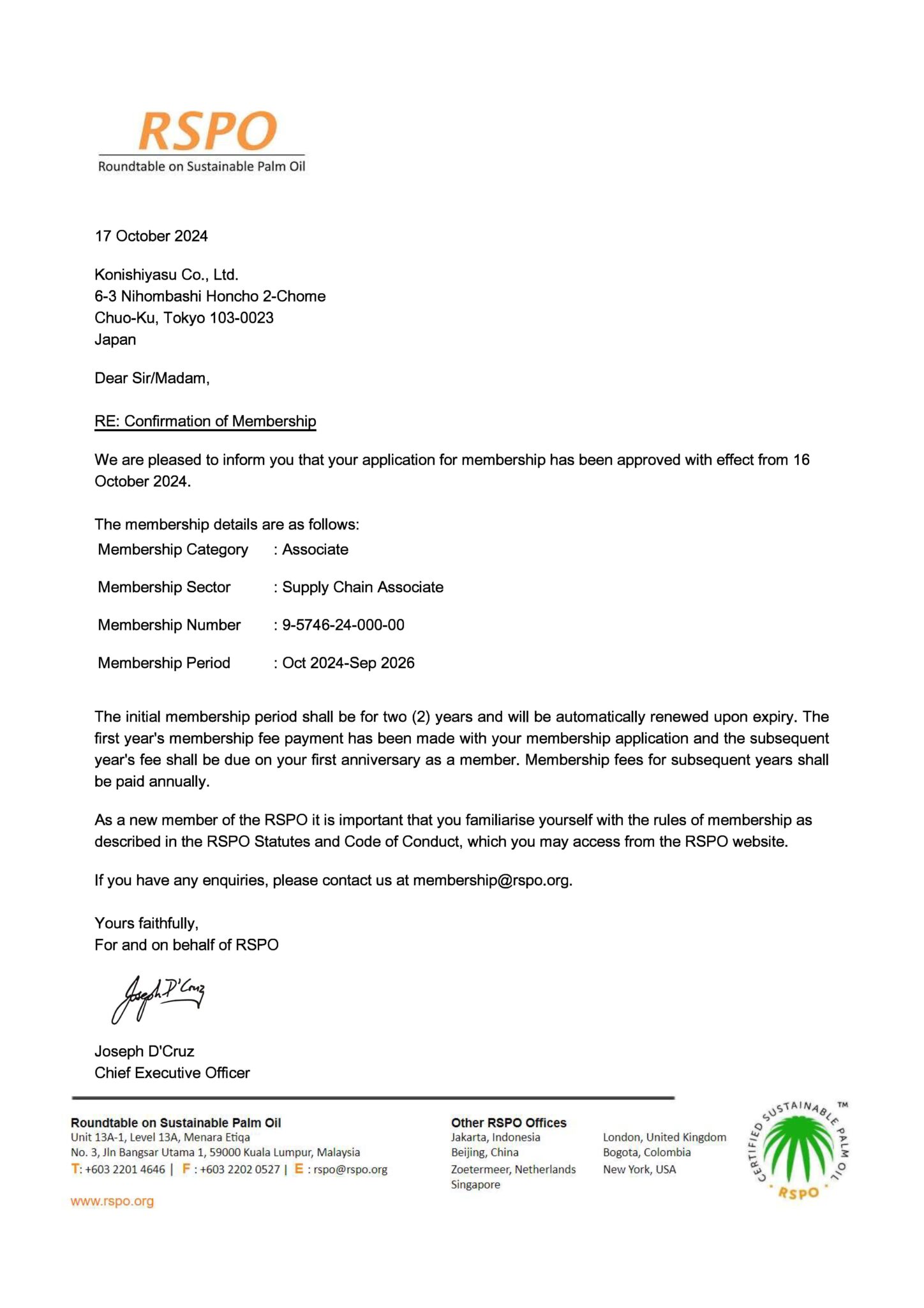 RSPO準会員加盟のお知らせ