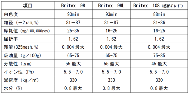 Britex108シリーズは、高い吸油量、優れた分散性、シャープな粒径分布、そして低摩耗性に優れており特に感熱紙分野において使用されております。