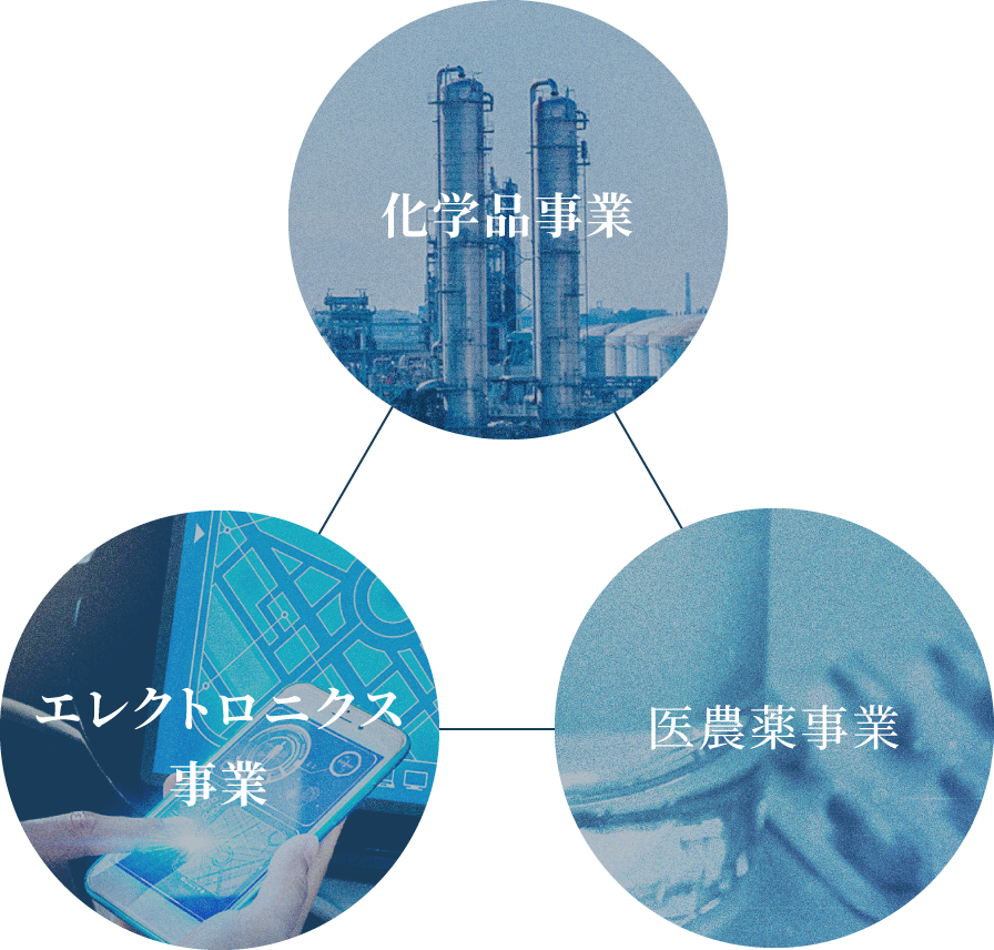 小西安株式会社は、化学品の専門商社であるため、多種多様な素材を扱っています。そのため、事業も大きく3つ(化学品事業、エレクトロニクス事業、医農薬事業)に分かれています。それぞれどのような仕事をしているのかご紹介します。