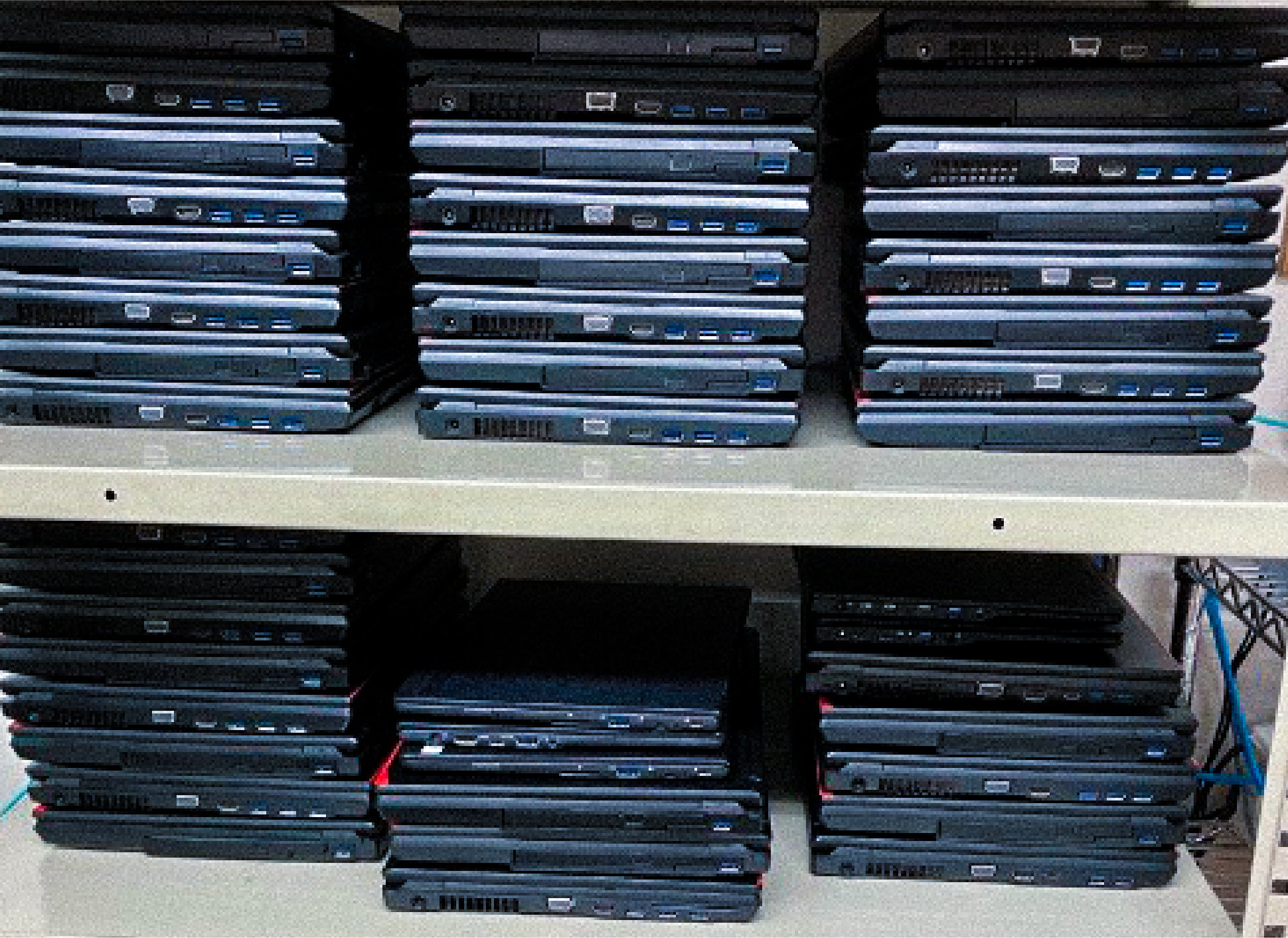 セキュリティソフトの更新をするために、社員のノートPCを回収して重ねました。すごい量です!
