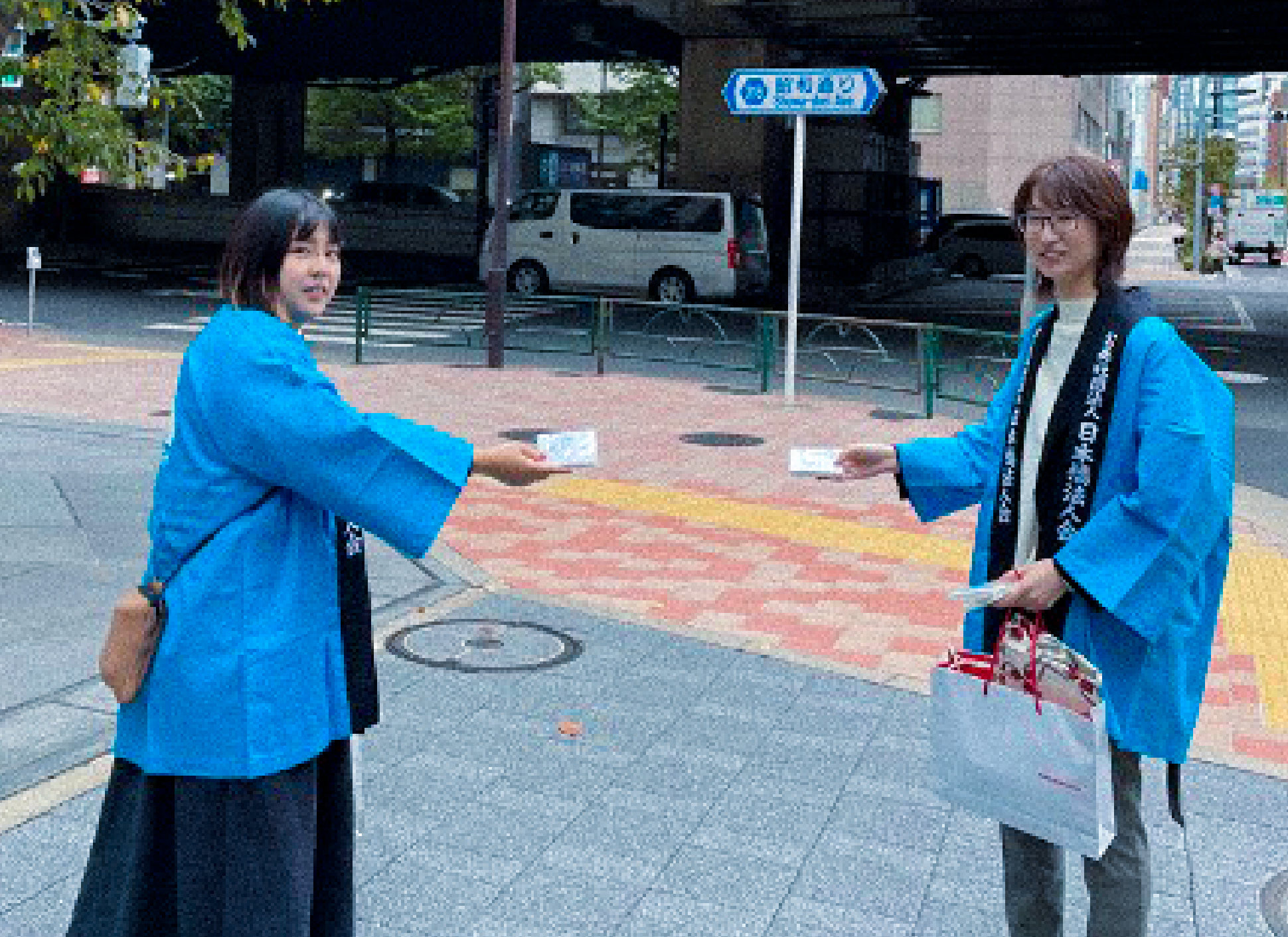 地域貢献の一環として日本橋法人会でティシュ配りを行っています。