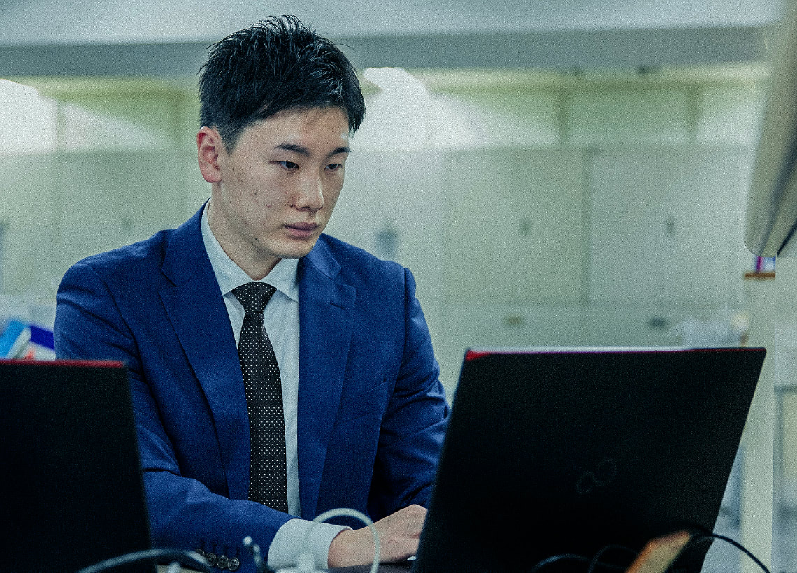 小西安を知ったきっかけは、就職活動の相談をした大学バスケ部OBからの紹介です。化学品についての知識は何もありませんでしたが、商社なら人間力で勝負できると思って志望しました。入社の決め手になったのは、採用の過程で出会った社員の方々が、とても温かな対応で自分の良さを自然に引き出してくれたことです。入社後は経理部に配属となりました。当社では経理部が一般的なシステム部の業務を行っていて、私はそのシステム業務の担当となりました。それまでシステムやネットワークに触れたことのなかった私にとっては、何もかもが未知の領域です。配属当時は、先輩から教えてもらった操作を、間違えないように繰り返すだけで精一杯でした。